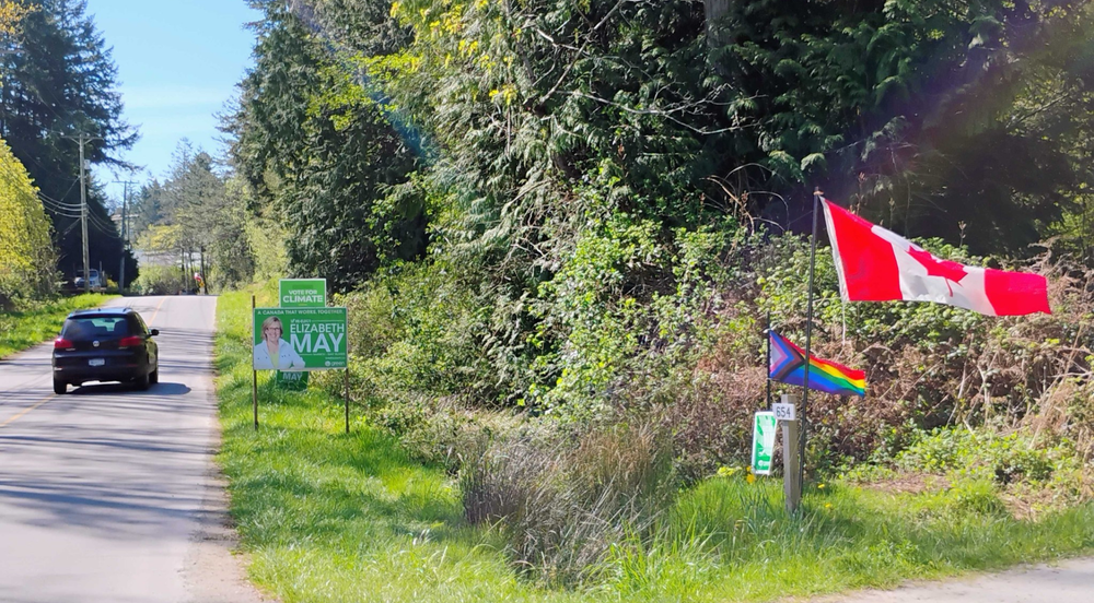 Roadside view of Elizabeth May's 2025 federal election campaign sign alongside a Canadian flag and a Progress flag near a rural driveway. (Source: Facebook)
