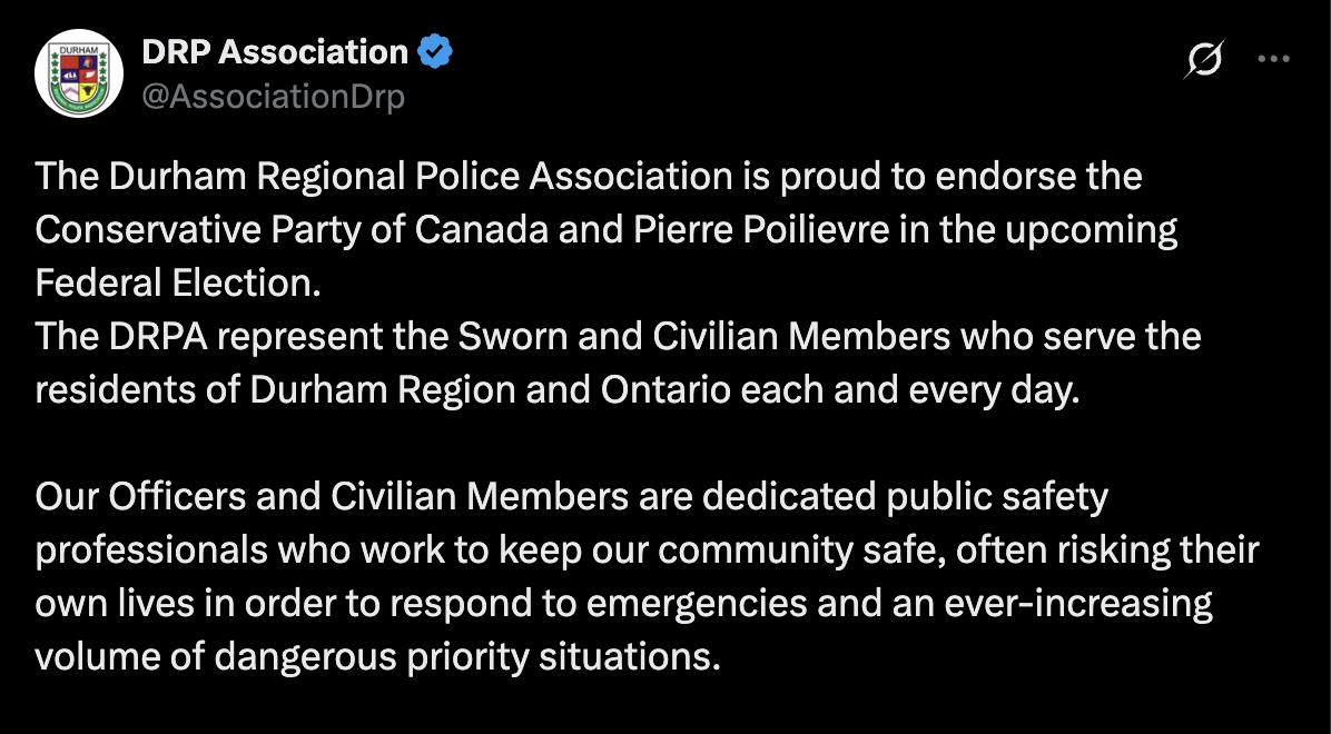 This week, the Durham Regional Police Association (DRPA) got people talking. Not for community service or a landmark case—but for a social media post. In it, they announced their support for a political party in the upcoming federal election.