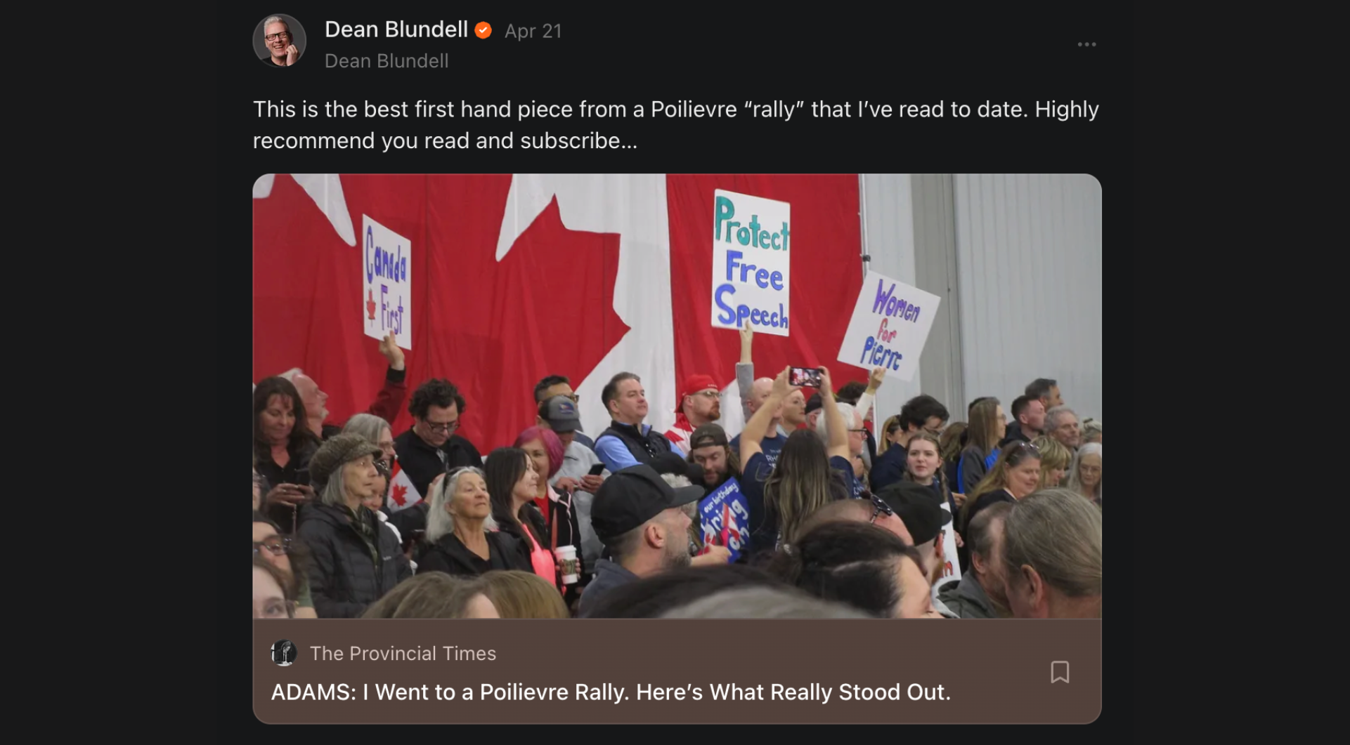 When Dean Blundell publicly endorsed it—calling it “the best first-hand piece from a Poilievre rally” he'd read up to that point—it felt surreal. Not because it was flattering (though it was), but because it confirmed something I'd been quietly hoping for: that there is an appetite for honest, unvarnished reporting, even when it makes people uncomfortable.
